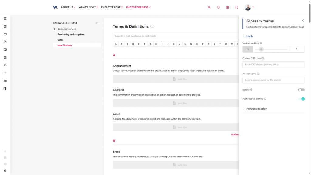 Description: We’ve added automatic alphabetical sorting to the Glossary block, so all terms now stay neatly structured, without any manual work. This ensures that even as new terms are added or edited, the glossary remains clean, consistent, and easy to browse.