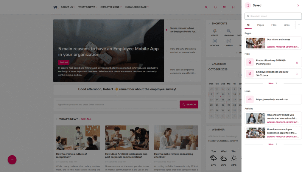 Description: We’ve addes a new Saved Items panel, a centralized space where users can save, access, and organize important content from across the entire WORKAI® platform. Accessible directly from the top navigation bar, this panel makes it easy to bookmark intranet pages, articles, files, links, and even contact profiles, all without leaving the current page.
