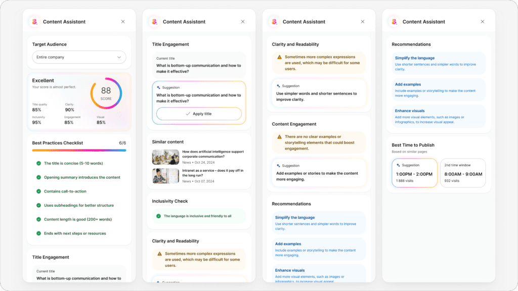 Workai koncentruje się natomiast na perspektywie użytkownika końcowego. Zamiast rozbudowanych procesów administracyjnych oferuje natywne podsumowania AI przy każdym artykule, automatyczne tagowanie tematów oraz linkowanie treści do powiązanych obszarów bazy wiedzy. W efekcie wiedza w Workai „sama się odnajduje”, a pracownik nie musi znać struktury intranetu, by dotrzeć do właściwej informacji.